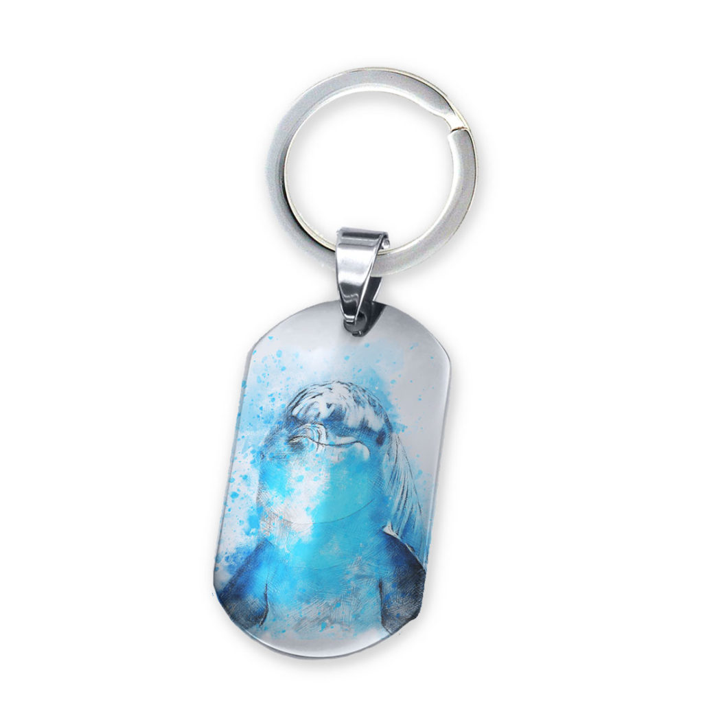 ステンレス製のドッグタグにオフセットプリントをして、写真やイラストをキーホルダーにします。