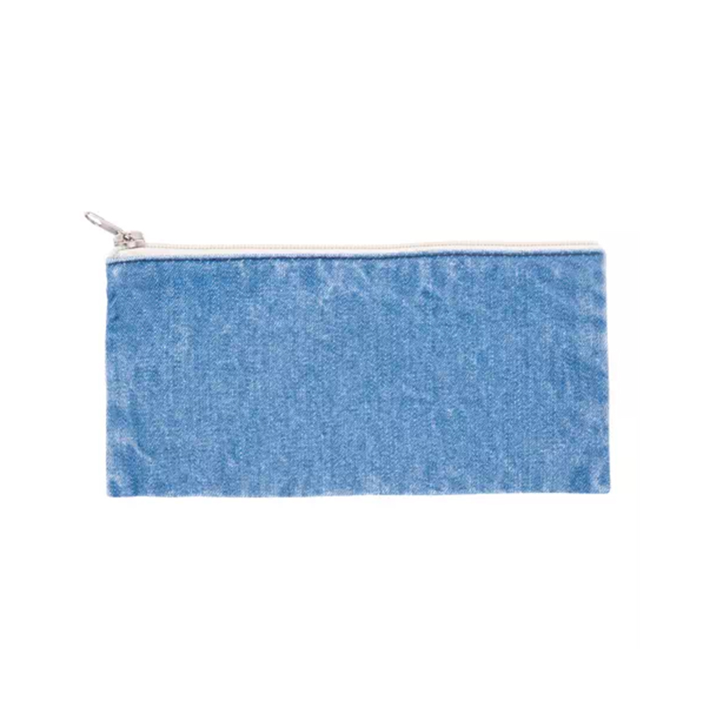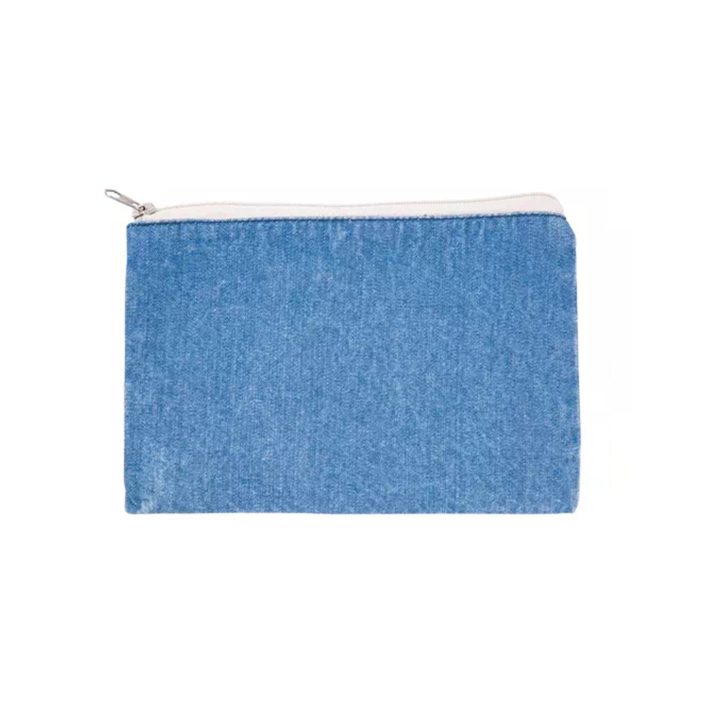 カジュアル感と耐久性を兼ね備えたデニムフラットポーチ。S/Mの2サイズ、インディゴ/ライトブルーの2カラー展開。コットン・ポリエステル混紡のしっかりしたデニム生地に、シルク1色〜フルカラー転写の名入れが可能です。