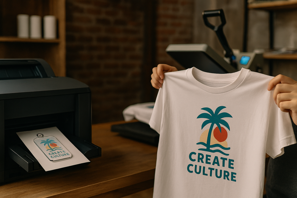 フィルムに出力 → 熱圧着。布にもポリエステルにもOK。版代ゼロでフルカラー対応。以前の転写はデザインの縁に透明のフィルムが見えて、いかにも「貼りました!」という見た目でしたが、その課題を改善んした転写方法です。主に布製品に使います。