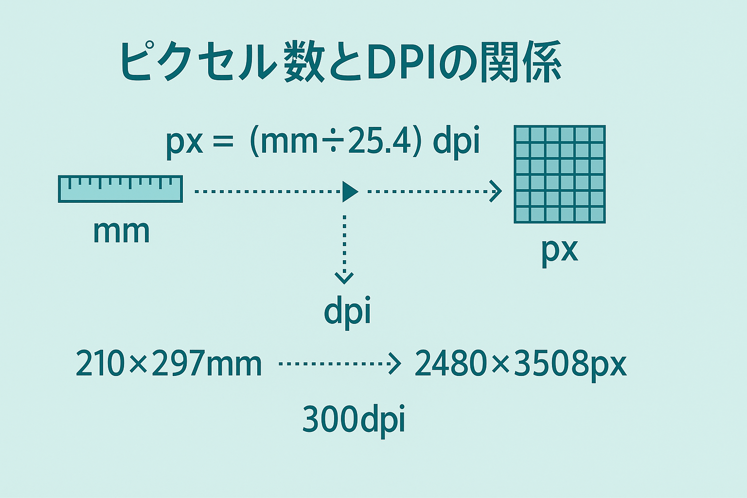 必要ピクセル数 = 印刷サイズ(mm)÷25.4 × dpi。ざっくり基準は300dpi。例として: