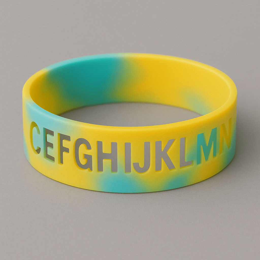ラバーバンド本体をくり抜いてロゴや文字を貫通させる加工です。